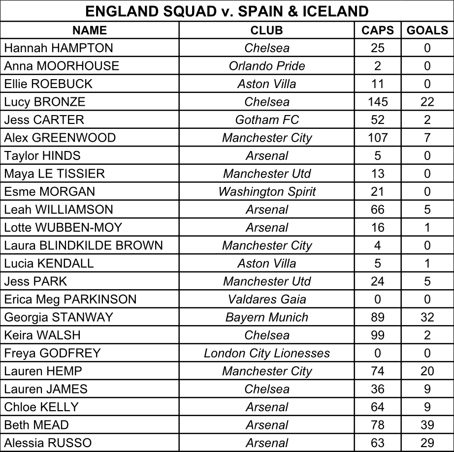 21 players were part of the squad who featured in last month’s opening victories against Ukraine and Iceland. Midfielder Erica Meg Parkinson, who plays for Portuguese first division side Valadares Gaia, earns her first call up to the seniors after featuring across the England pathway. Beth Mead returns, whilst Aggie Beever-