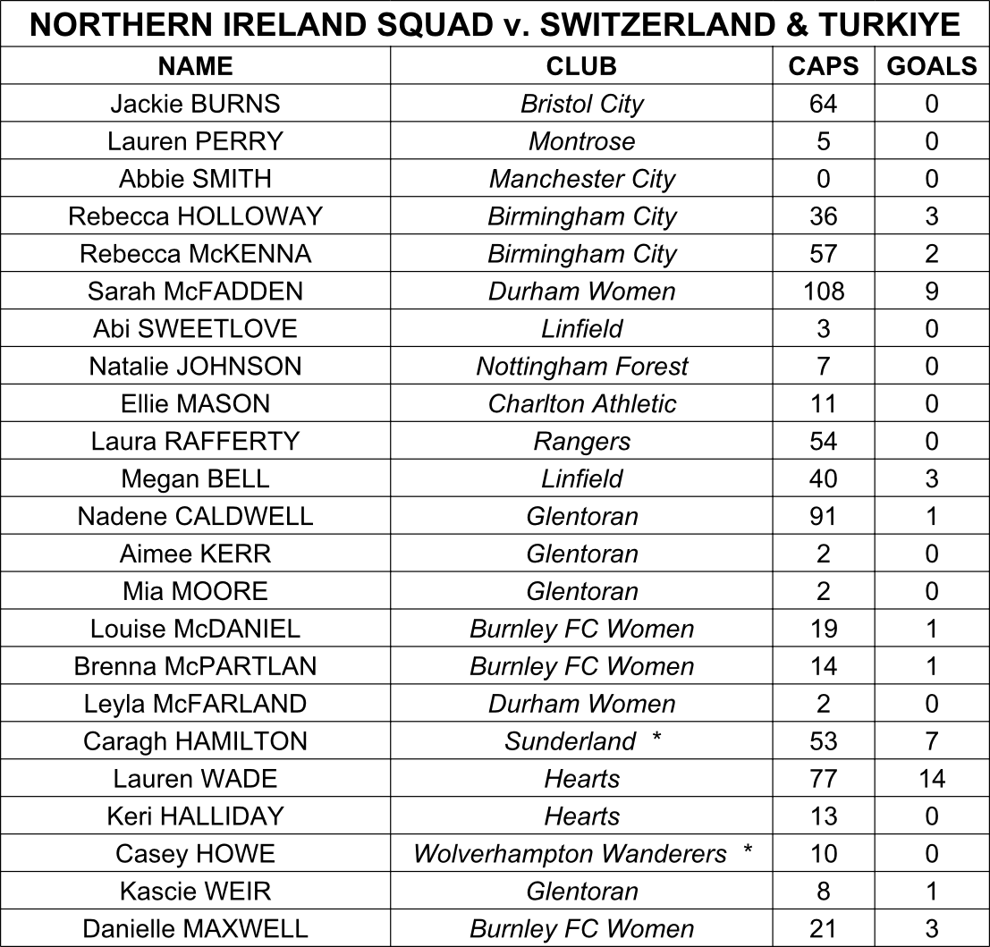 Experienced Rangers Women defender Laura Rafferty returns to the squad after missing out on the Iceland games through injury. Also back are Charlton Women defender Ellie Mason and Burnley Women midfielder Brenna McPartlan, who were both absentees from those UWNL play-